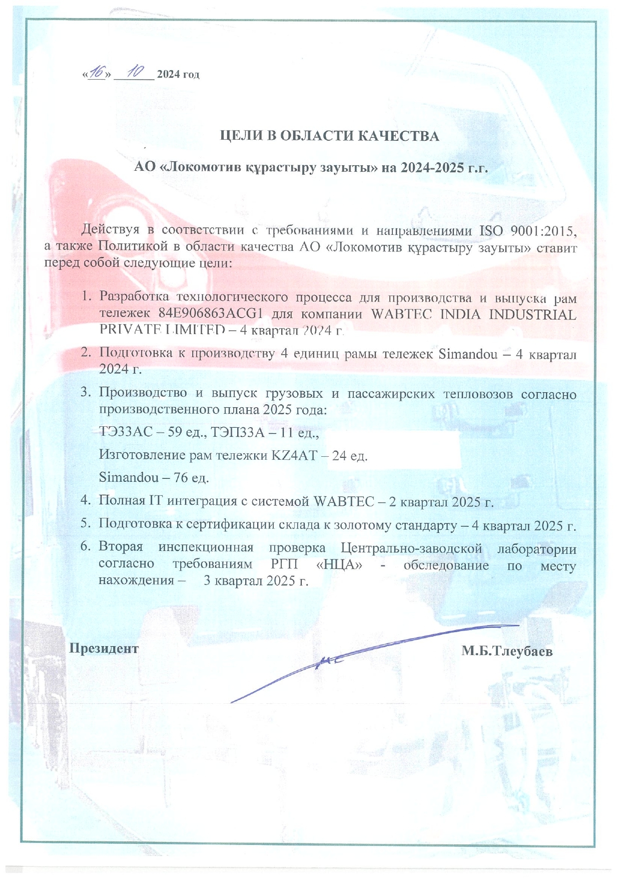 В целях улучшения качества сборки тепловозов достичь уменьшения несоответствий на единицу продукции на 5% по сравнению с прошлым годом.